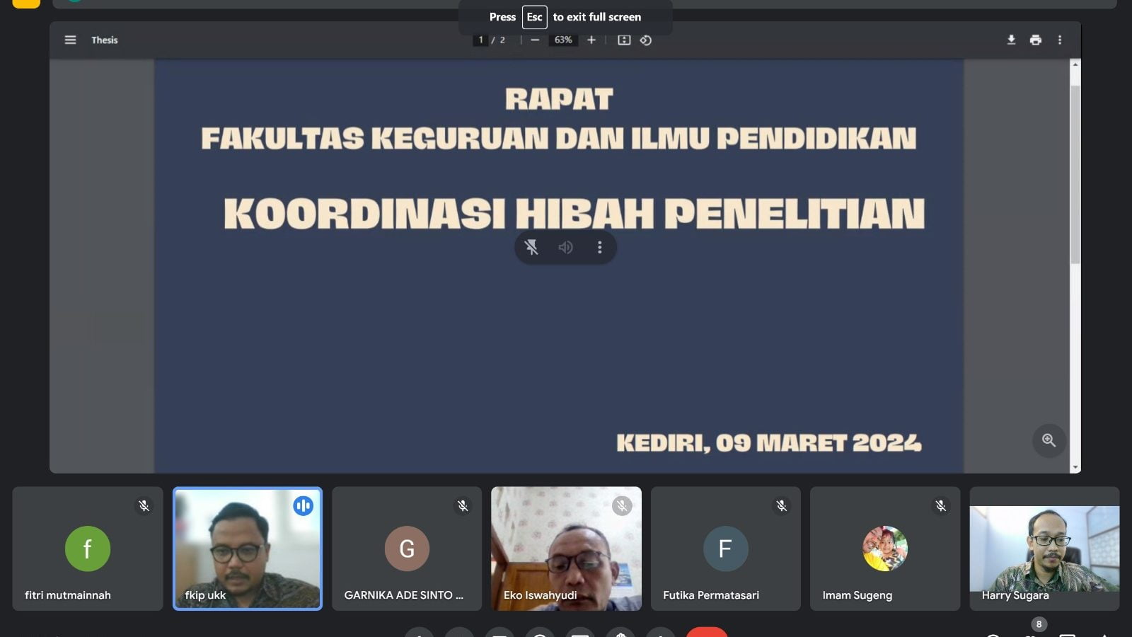 Pada hari Sabtu, 9 Maret 2024, Dekan FKIP menggelar sesi sosialisasi hibah penelitian yang diselenggarakan oleh Direktorat Riset Teknologi Pengabdian Masyarakat (DRTPM) melalui platform daring, Google Meet. Dalam pertemuan tersebut, Ganes Tegar Derana, M.Pd selaku Dekan FKIP dan juga Imam Sugeng, M.Pd selaku Kaprodi PJKR serta Fitri Mutmainah, M.Pd selaku kaprodi PPKn dengan antusias menyambut para dosen dari kedua jurusan di lingkungan FKIP untuk berpartisipasi aktif dalam program hibah penelitian yang ditawarkan oleh DRTPM.